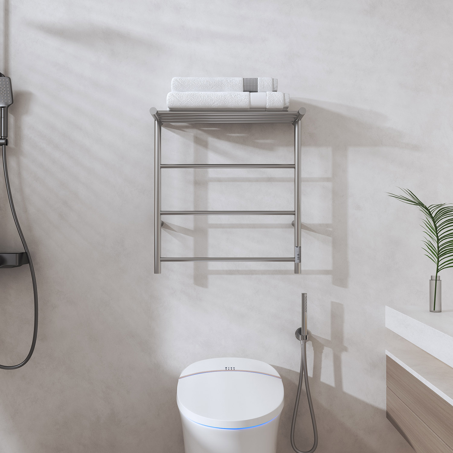 7桿時(shí)控開關(guān)電熱毛巾架 7 bar time switch heated towel rail 材質(zhì)Material:SS201/SS304 功率Power:220V/90W 表面Surface:Mirror Polished 鏡面拋光 尺寸Size:630*250*680mm 包裝Ctn size:650*270*710mm