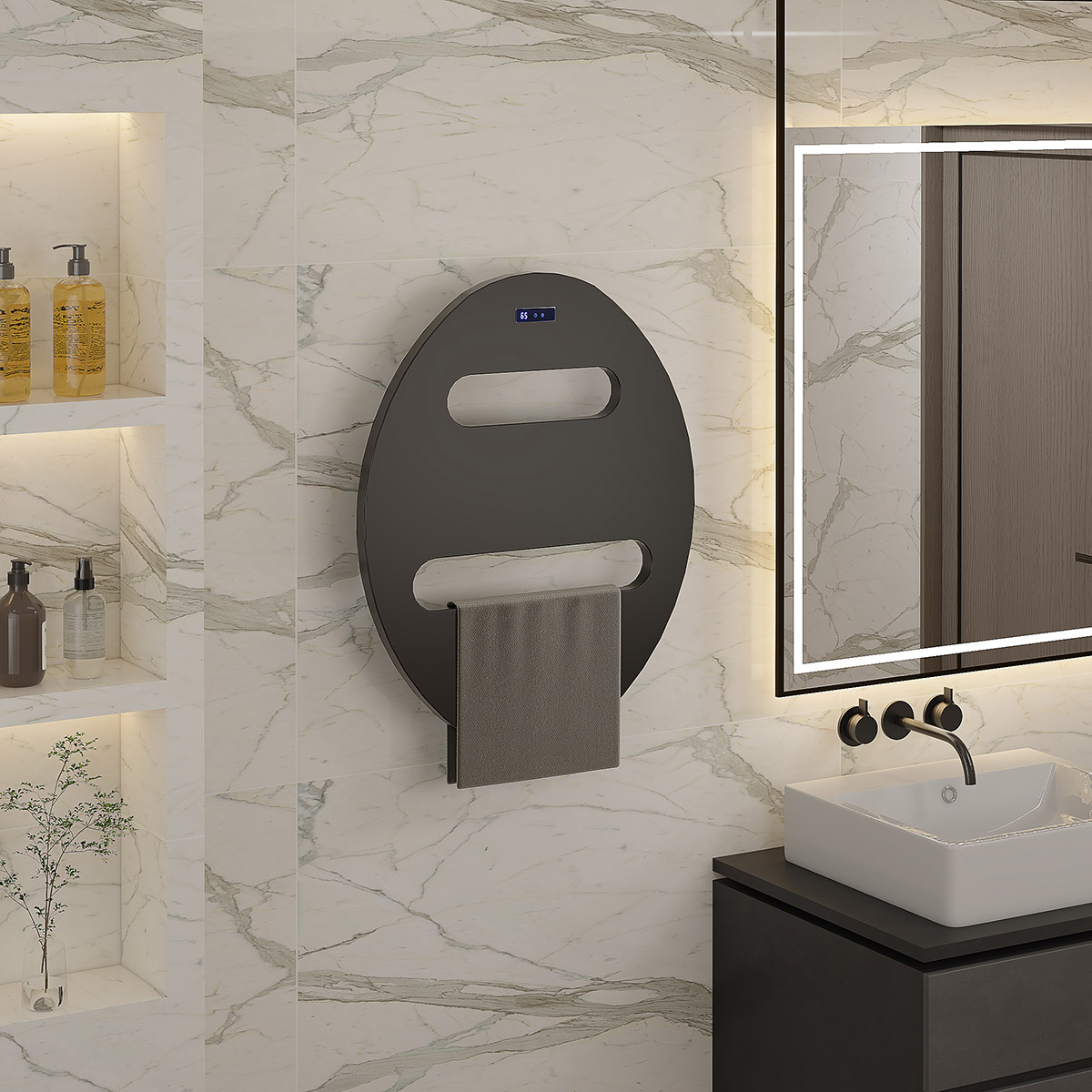 板式液顯多功能開關電熱毛巾架 Panel LCD display multifunction switch heated towel rail 材質Material:Aluminum 鋁 功率Power:220V/130W 表面Surface:Black Painted 黑色噴塑 尺寸Size:600*90*800mm 包裝Ctn size:640*110*860mm