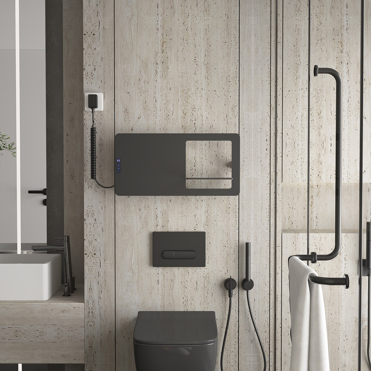 板式液顯多功能開關電熱毛巾架 Panel LCD display multifunction switch heated towel rail 材質Material:Aluminum 鋁 功率Power:220V/100W 表面Surface:Black Painted 黑色噴塑 尺寸Size:600*80*300mm 包裝Ctn size:650*80*350mm