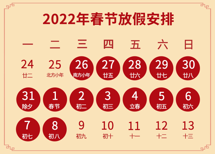 1月26日(臘月二十廿四)至2月8日(正月初八)放假調(diào)休,共14天,2月9日(正月初九)恢復(fù)正常上班。如有任何問題,請及時與對接業(yè)務(wù)員聯(lián)系。
